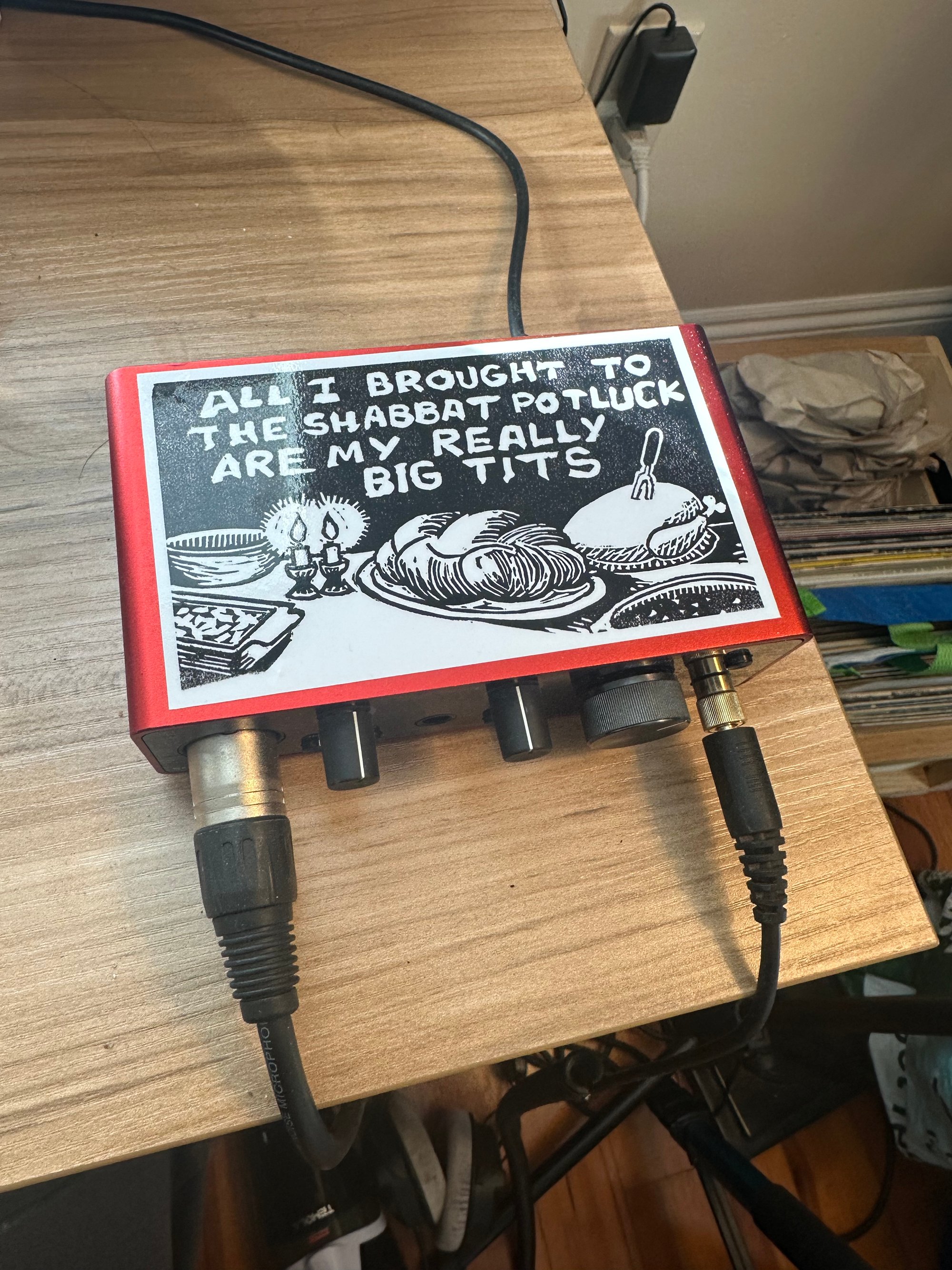An 3"x5" sticker of the design "All I Brought To The Shabbat Potluck Are My Really Big Tits". Shipping included for US.